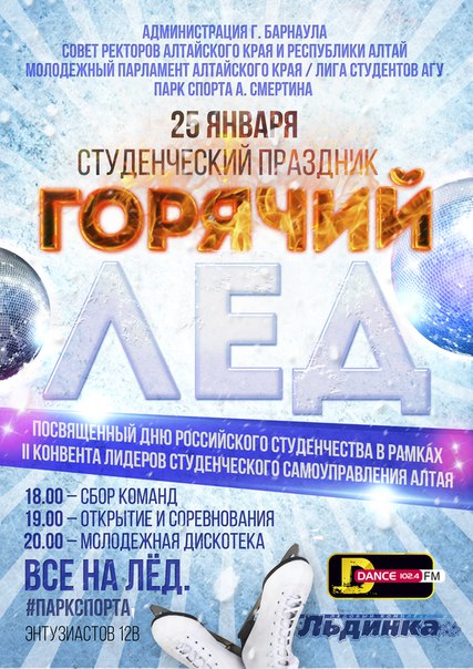 08:04 25 января на Энтузиастов 12В пройдет студенческий праздник Горячий лед. Посвященный дню Российского студенчества в рамках II конвента лидеров студенческого самоуправления Алтая. 18.00 - Сбор команд ВСЕ НА ЛЕД! Просмотров: 944 |