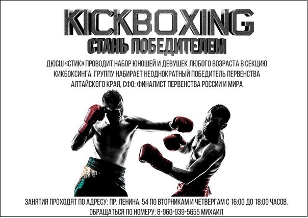 12:16 ДЮСШ «СТИК» проводит набор юношей и девушек любого возраста в секцию кикбоксинга. Группу набирает неоднократный победитель Первенства Алтайского края, СФО; финалист первенства России и Мира –Михаил Астанин. Занятия проходят по адресу: пр. Ленина, 54 по ВТОРНИКАМ и ЧЕТВЕРГАМ с 16:00 до 18:00 часов. Возможны индивидуальные занятия. Занятия кикбоксингом дают важные навыки самообороны и развивают целый комплекс физических качеств: гибкость, силу, ловкость, быстроту реакции, координацию движений, чувство равновесия, концентрацию внимания, выносливость. Тренировки способствуют гармоничному телесному развитию и отличной функциональной подготовке. По желанию возможно участие в разнообразных соревнованиях, получение разрядов и достижение профессиональных высот в спорте. Обращаться в личные сообщения Михаилу, либо по номеру: 8-960-939-5655